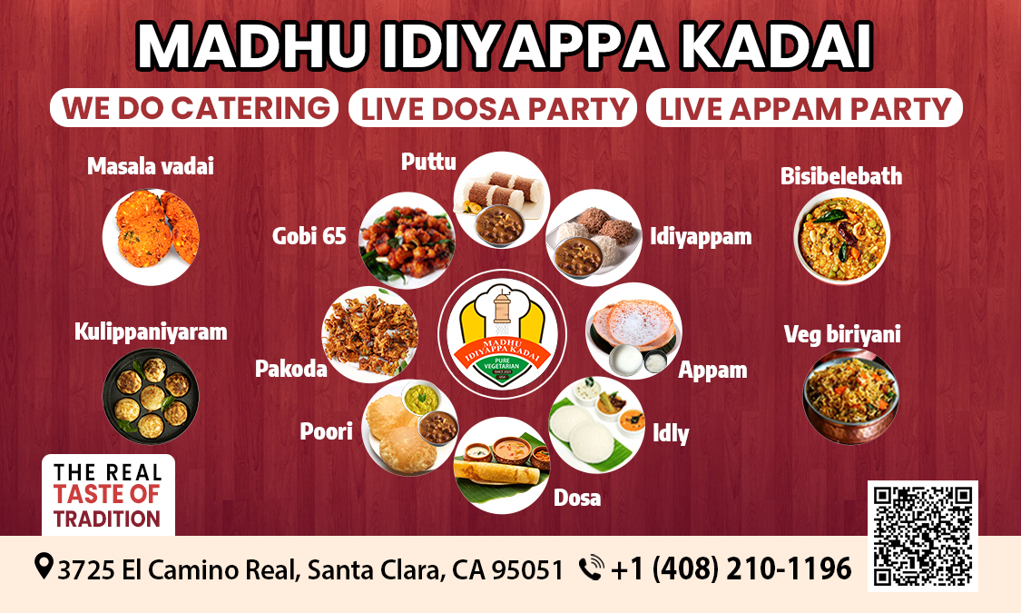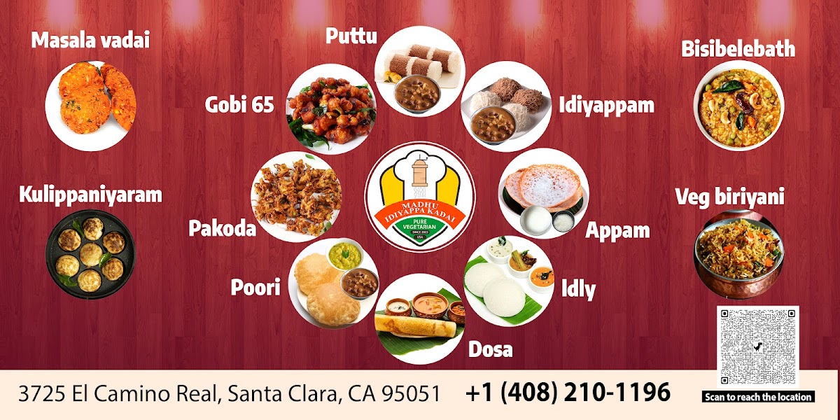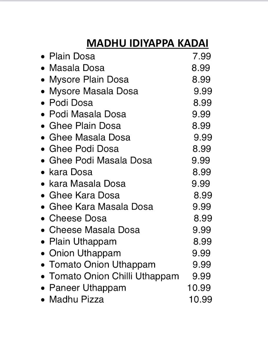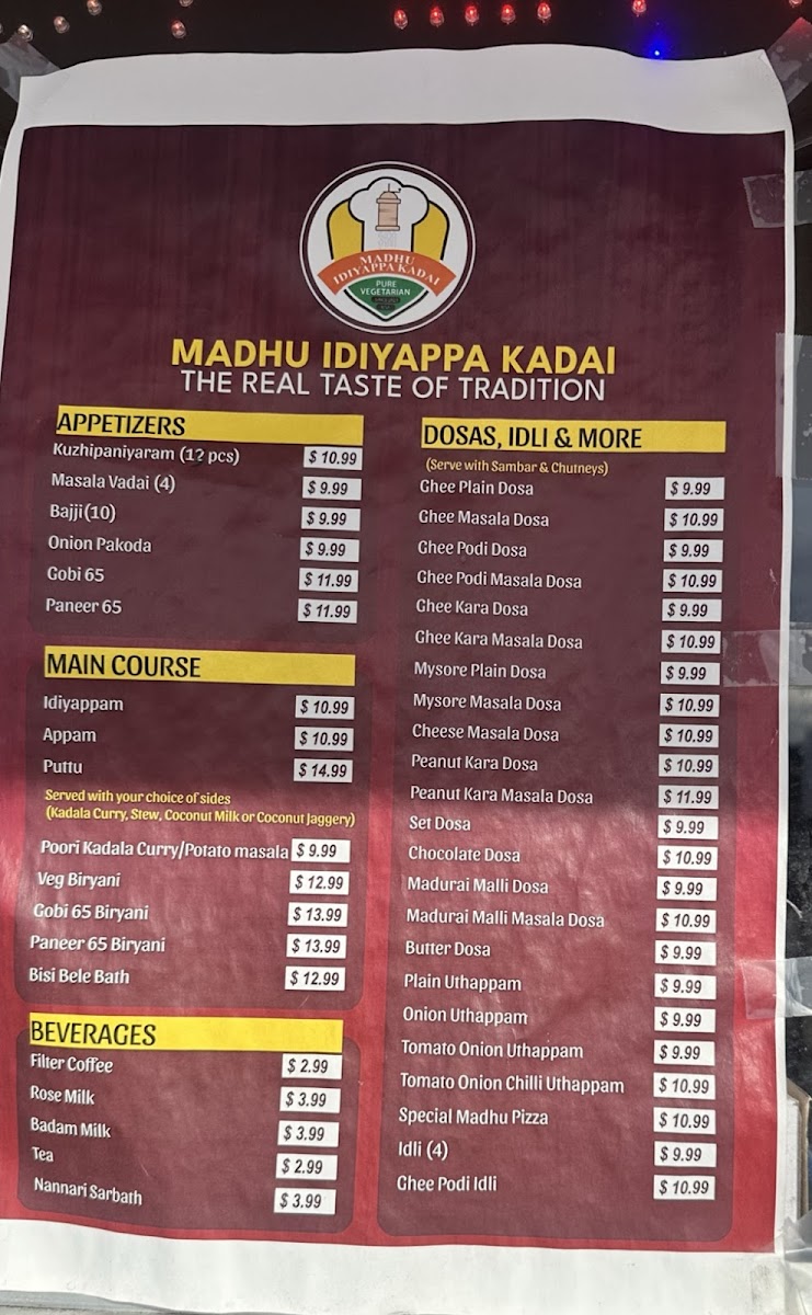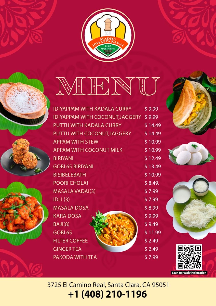 Madhu Idiyappa Kadai offers a thoughtfully curated menu that captures the essence of traditional South Indian vegetarian cuisine. The selection leans towards comforting dishes that are perfect for any time of day—whether you're craving a light breakfast or a satisfying meal later on. The menu features a variety of items like soft, steamed Idiyappam with Kadala Curry, crisp and flavorful Masala Vadai, and hearty options such as Puttu with Kadala Curry or Gobi 65 Biriyani.