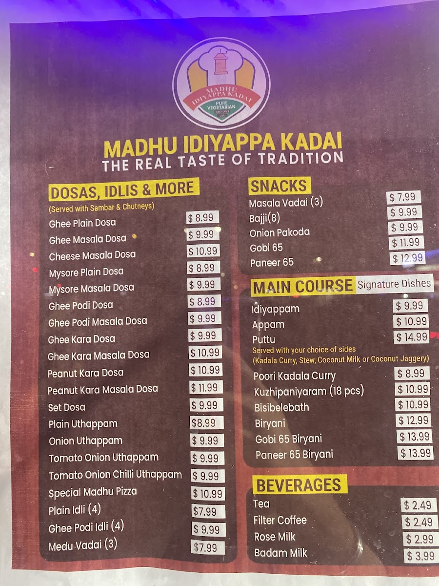 Whether stopping by for a quick bite or ordering catering for a low-key gathering, the menu’s traditional flavors provide a comforting backdrop that resonates with those seeking authentic South Indian vegetarian fare in a simple setting.